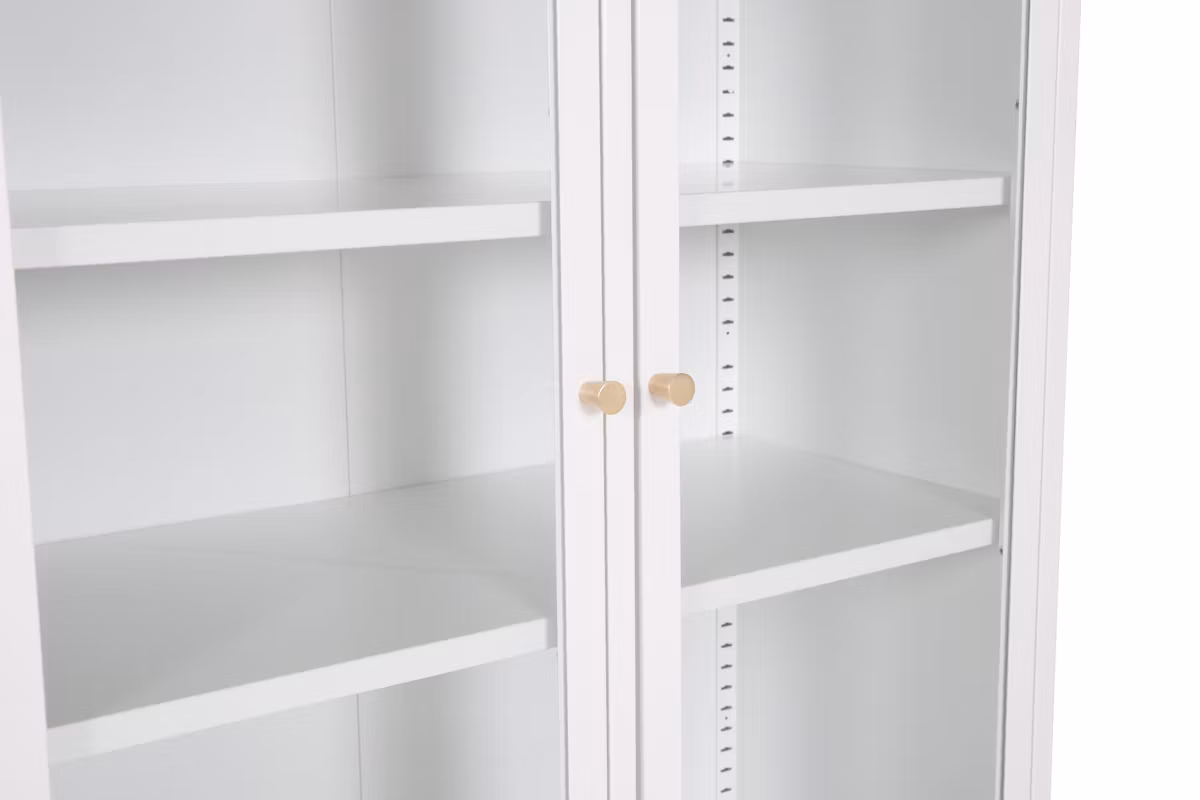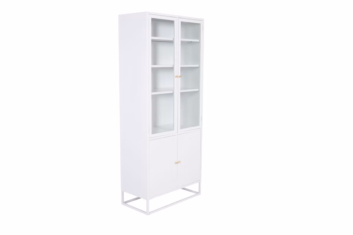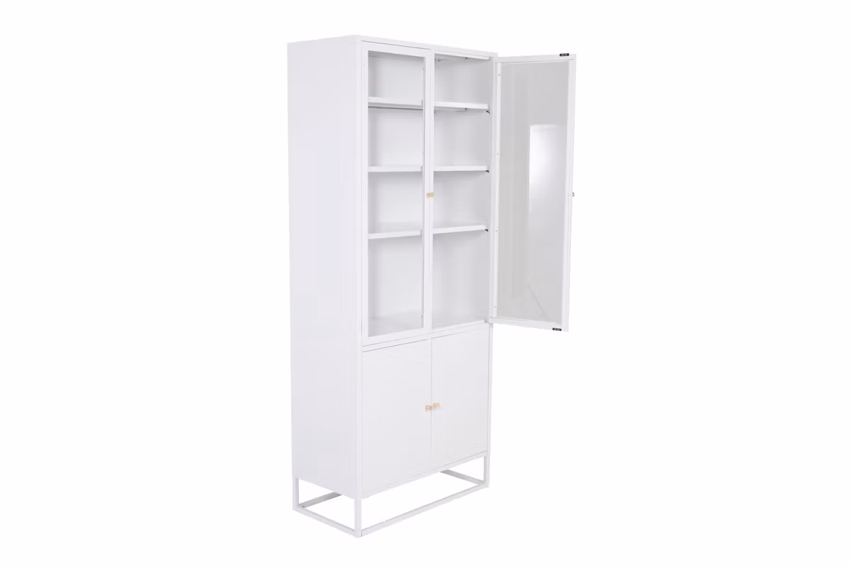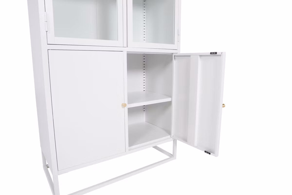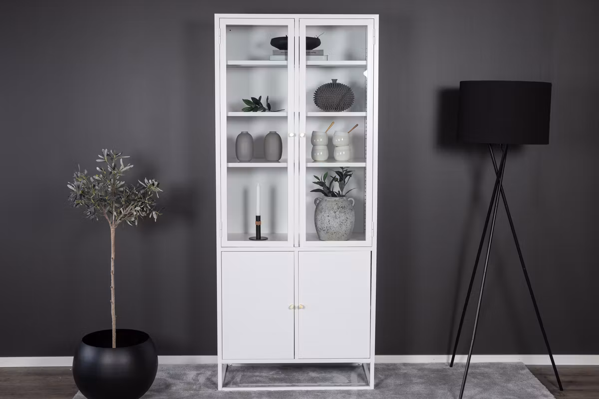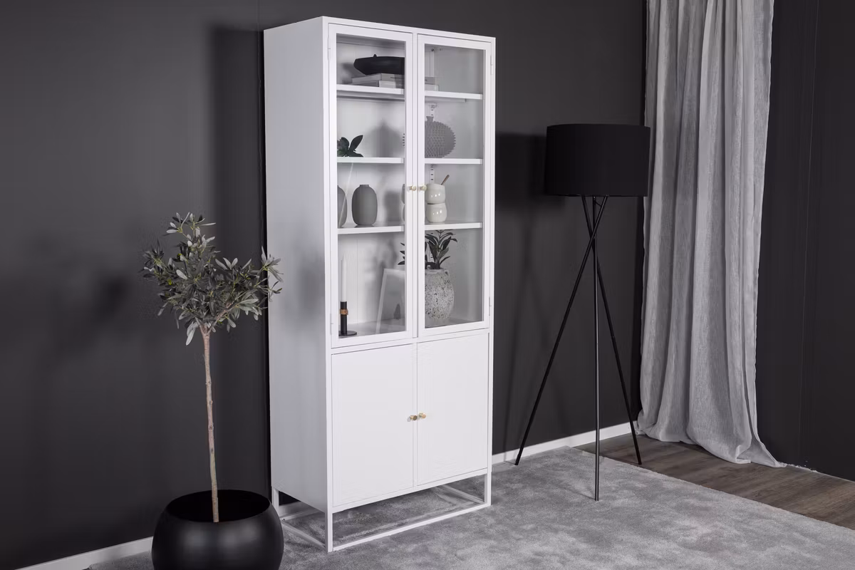 Den övre delen har två höga glasdörrar som släpper in ljus och låter dig visa upp porslin, glas eller dekorativa föremål på de fyra avlastningsytorna. Den nedre delen erbjuder två dörrar i stål och två hyllplan för praktisk, dold förvaring – perfekt för det du vill hålla utom synhåll.