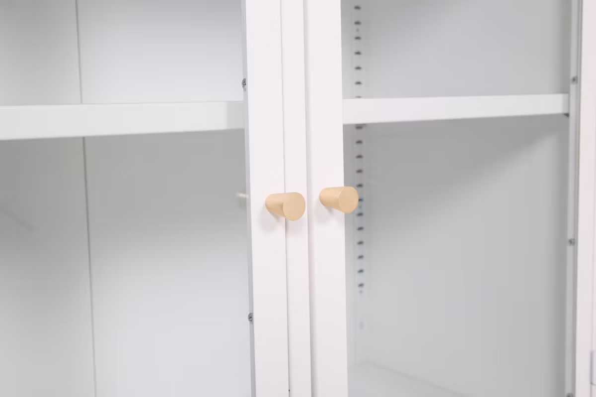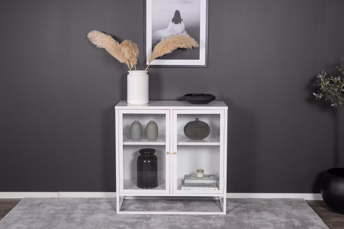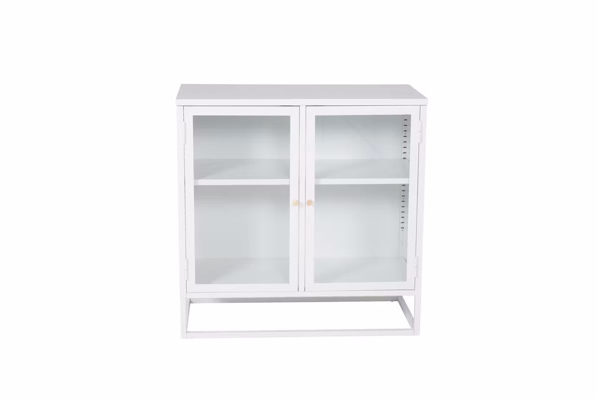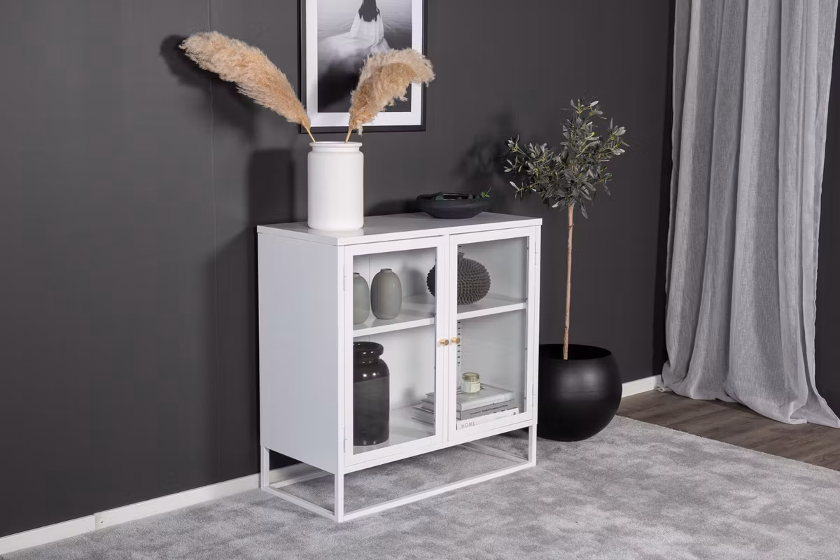 Ge hemmet ett stilrent lyft med Bakal, ett skåp i pulverlackerat vitt stål med två glasdörrar som skapar en luftig och modern känsla. Den öppna stålramen och de två praktiska avlastningsytorna ger både stabilitet och smart förvaring. Dörrarna pryds av eleganta, mässingsfärgade knoppar som adderar en exklusiv detalj.