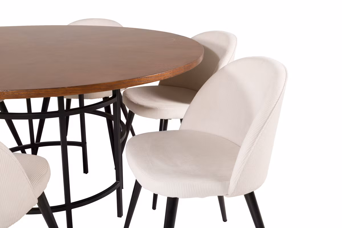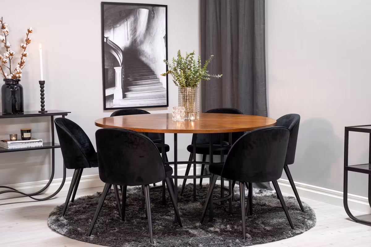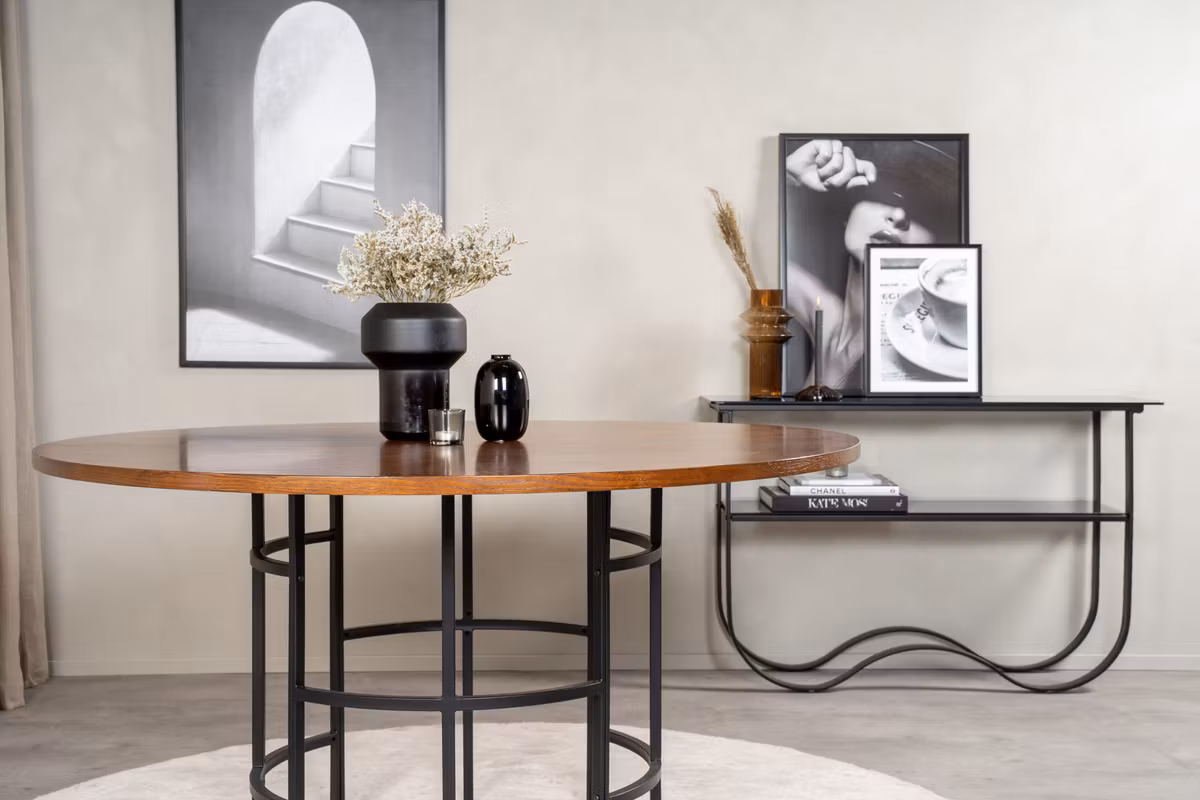 Upptäck Copenhagen, ett omtyckt runt matbord från Furniture Fashion som kombinerar stilren elegans med ett kaxigt uttryck. Den vackra brunfärgade bordsskivan i MDF vilar på ett dekorativt cylinderformat underrede i svart metall, vilket ger bordet ett pampigt och modernt utseende.