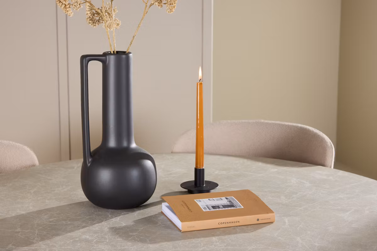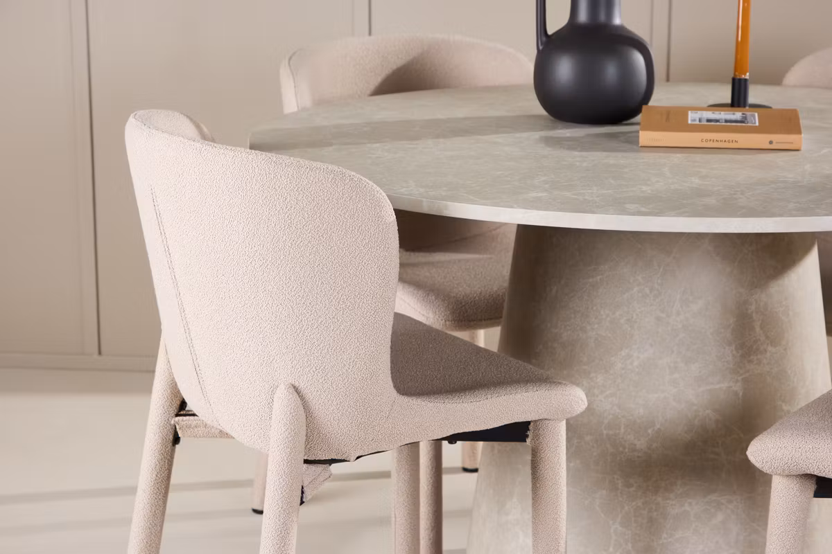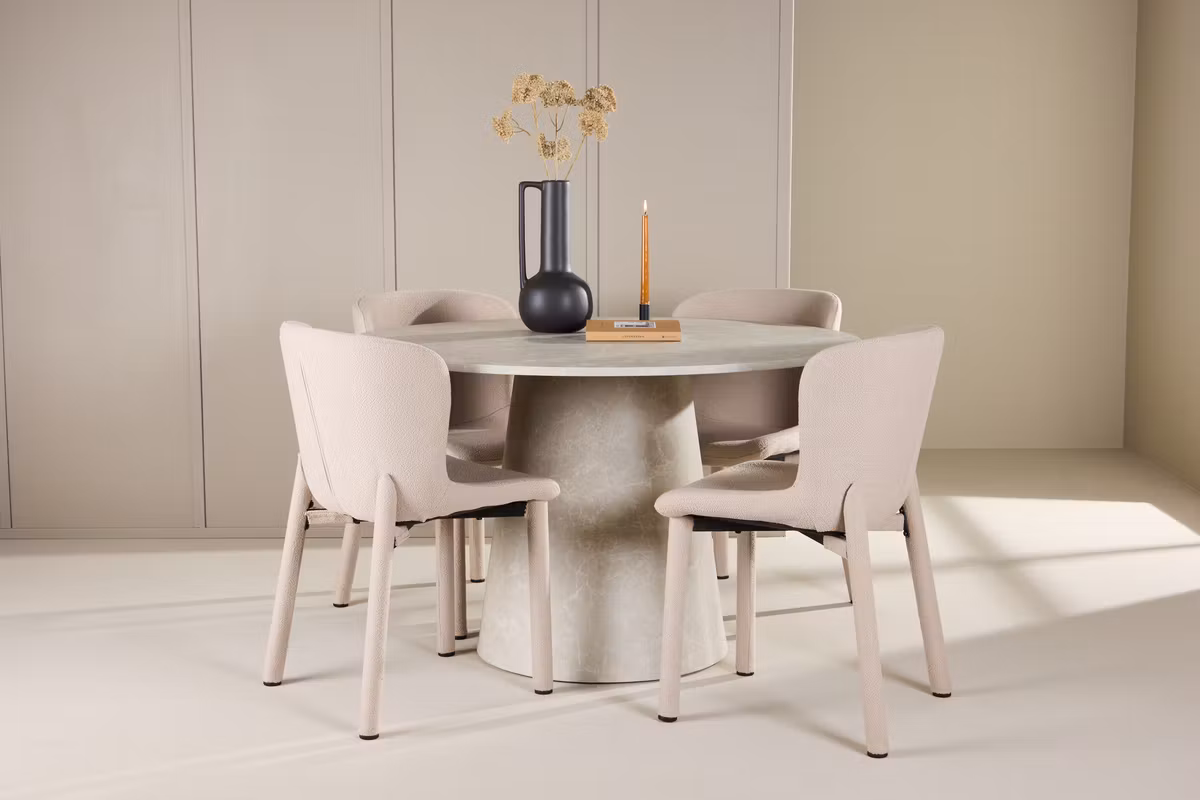 Lanzo matbord imponerar med en lyxig beige marmorinspirerad finish och har en rund, harmonisk form. Den enhetliga färgsättningen från bordsskiva till ben ger ett modernt, sammanhållet uttryck. Med en diameter på 120 cm erbjuder bordet gott om plats för både vardagsmiddagar och festliga tillfällen, samtidigt som den runda formen skapar en intim och trivsam känsla.