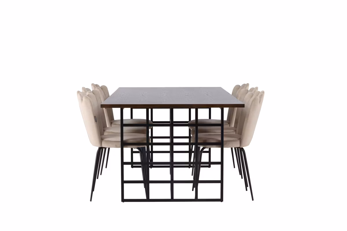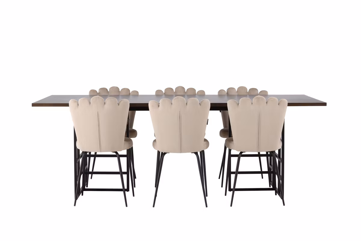Tillsammans med sammetsmatstolarna från serien Limhamn skapas en inbjudande och stilfull helhet. Stolen har en dekorativ snäckformad rygg med elegant dekorsöm som ger ett mjukt och exklusivt uttryck. Den rundade sitsen är klädd i smakfullt beige sammetstyg som förstärker känslan av lyx, medan de svart pulverlackerade metallbenen ger stabilitet och en snygg kontrast.