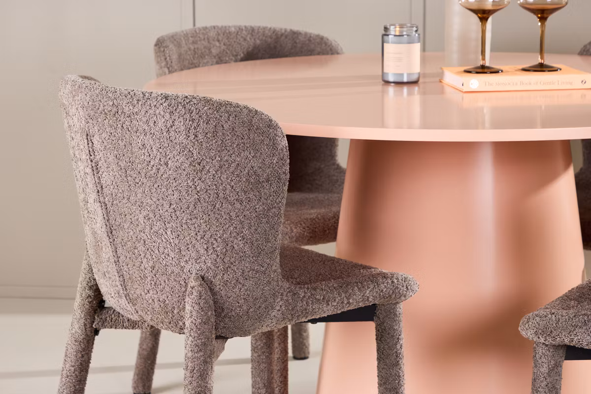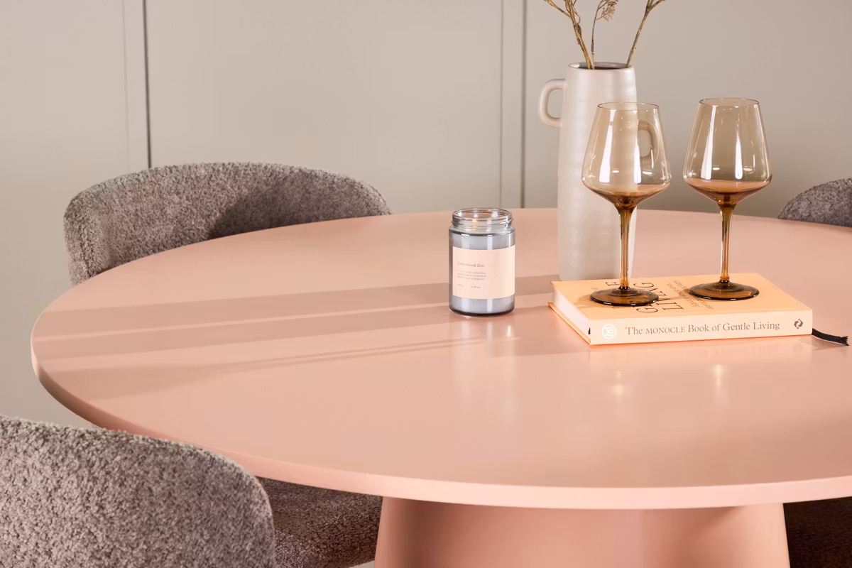 Lanzo matbord imponerar med sin vackra peachfärgade finish och runda, harmoniska form. Den enhetliga färgsättningen från bordsskiva till ben ger ett modernt, sammanhållet uttryck. Med en diameter på 120 cm erbjuder bordet gott om plats för både vardagsmiddagar och festliga tillfällen, samtidigt som den runda formen skapar en intim och trivsam känsla.