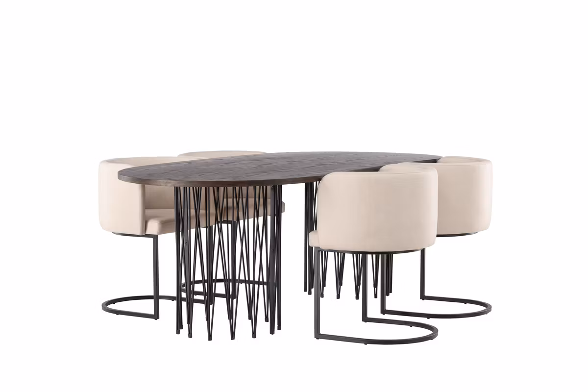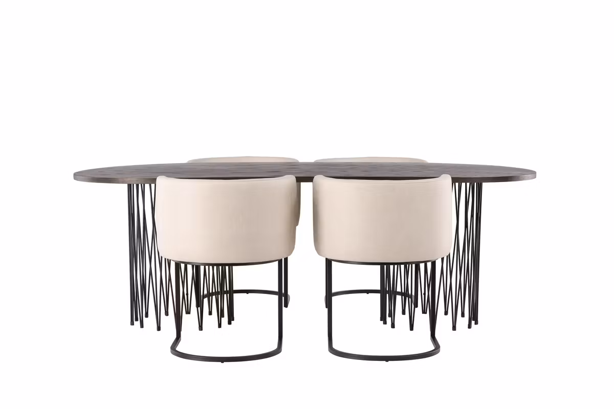 Matbordet kombineras med de sofistikerade matstolarna från serien Simrishamn. Stolarna har en helklädd sits med rundat ryggstöd i beige TC-tyg samt en minimalistisk benstomme i svart stål som ger både hög komfort och ett modernt uttryck.
