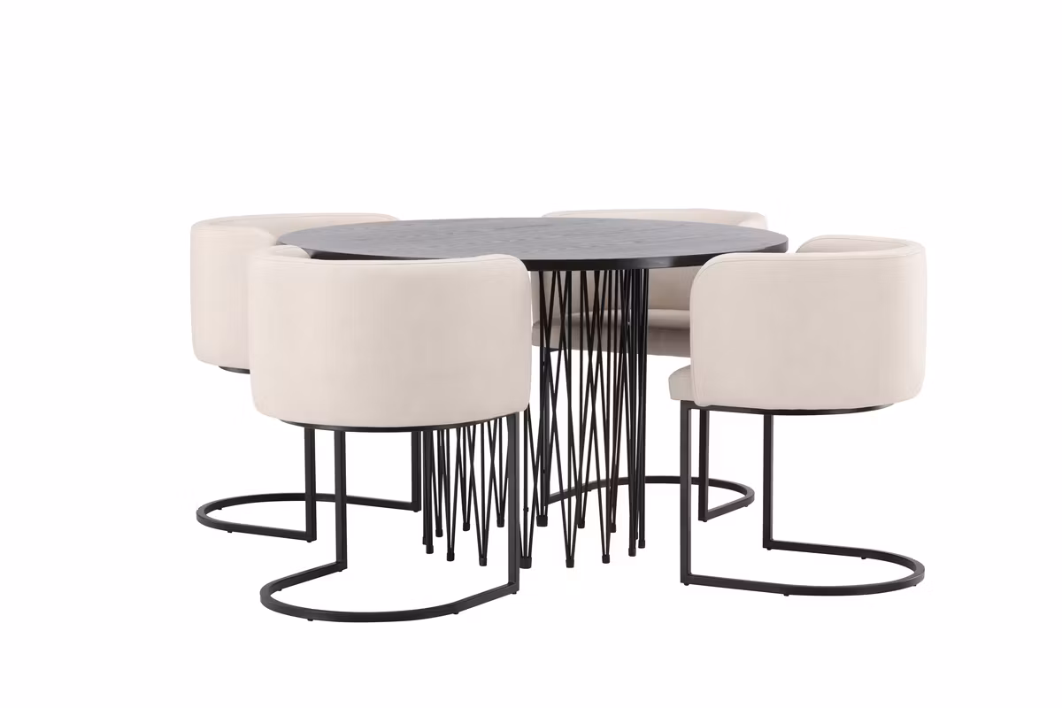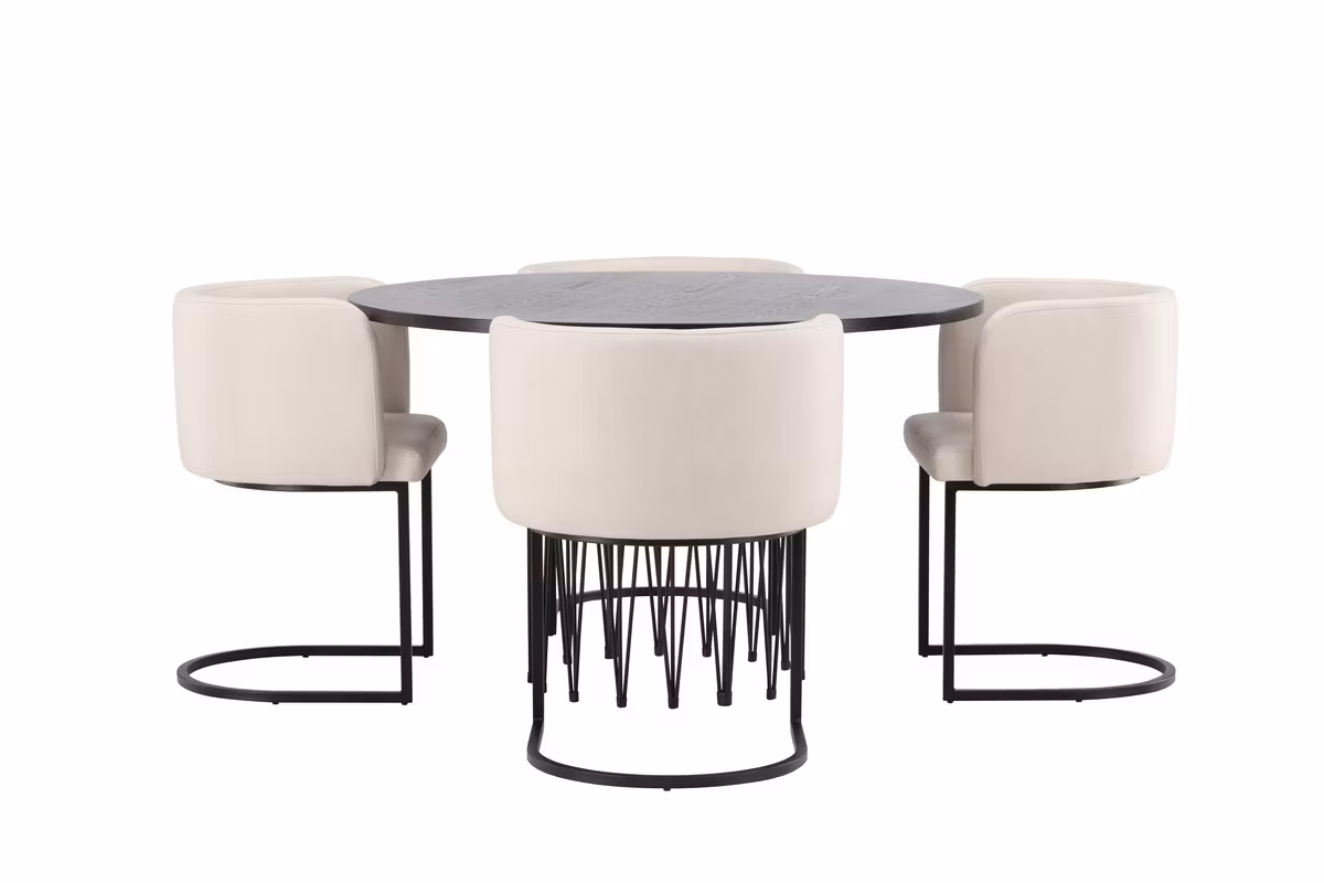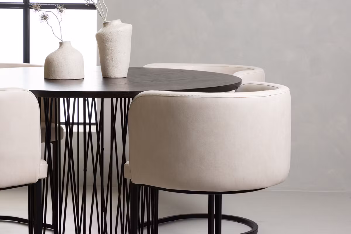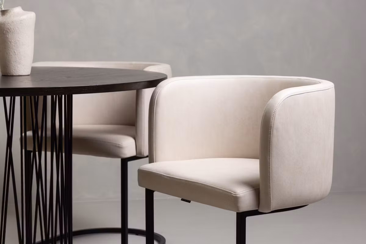 Tillsammans med de eleganta matstolarna från serien Simrishamn får matplatsen ett harmoniskt och lyxigt uttryck. Stolarna har en helklädd sits med rundat ryggstöd i beige TC-tyg och en minimalistisk benstomme i svart stål som ger både komfort och ett modernt intryck.