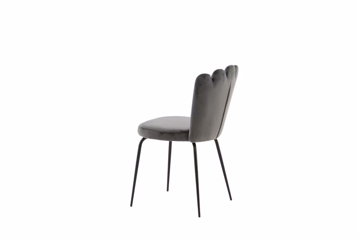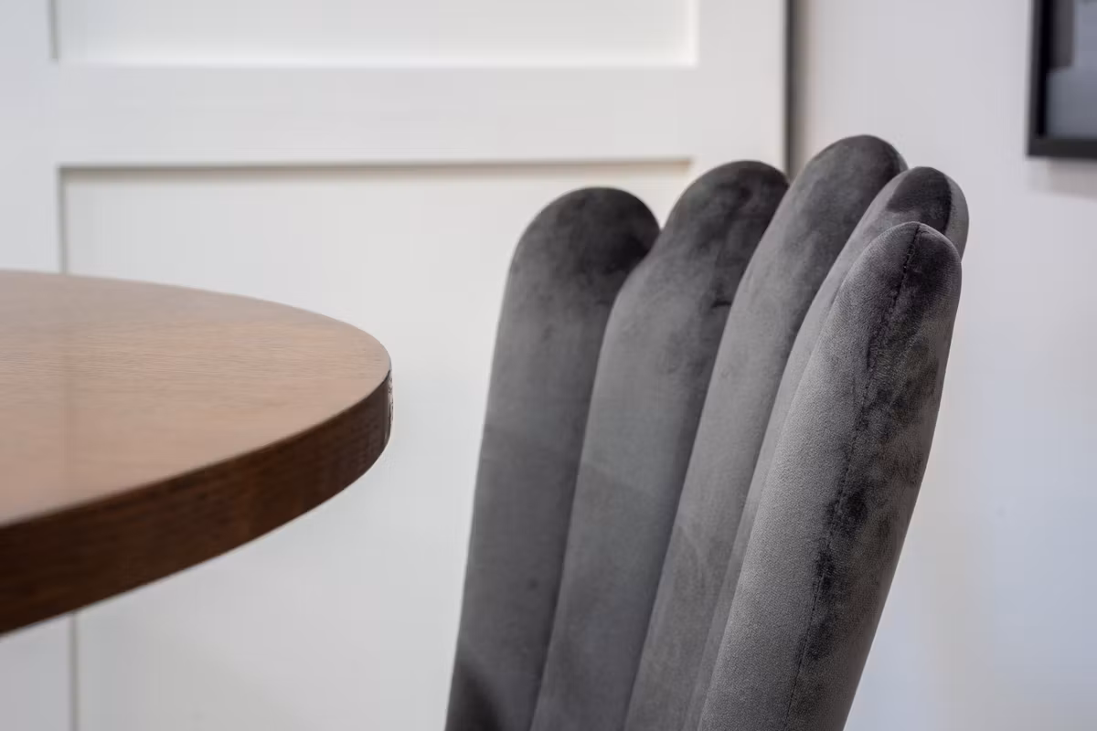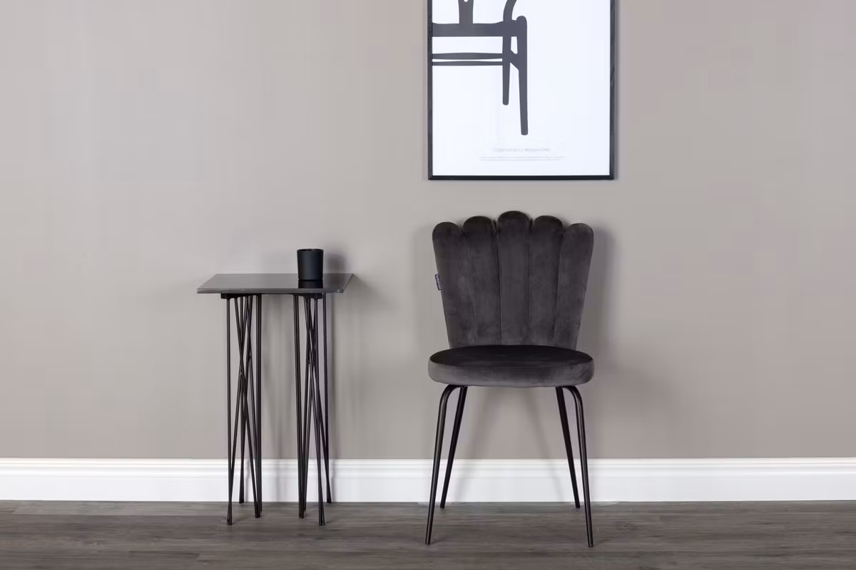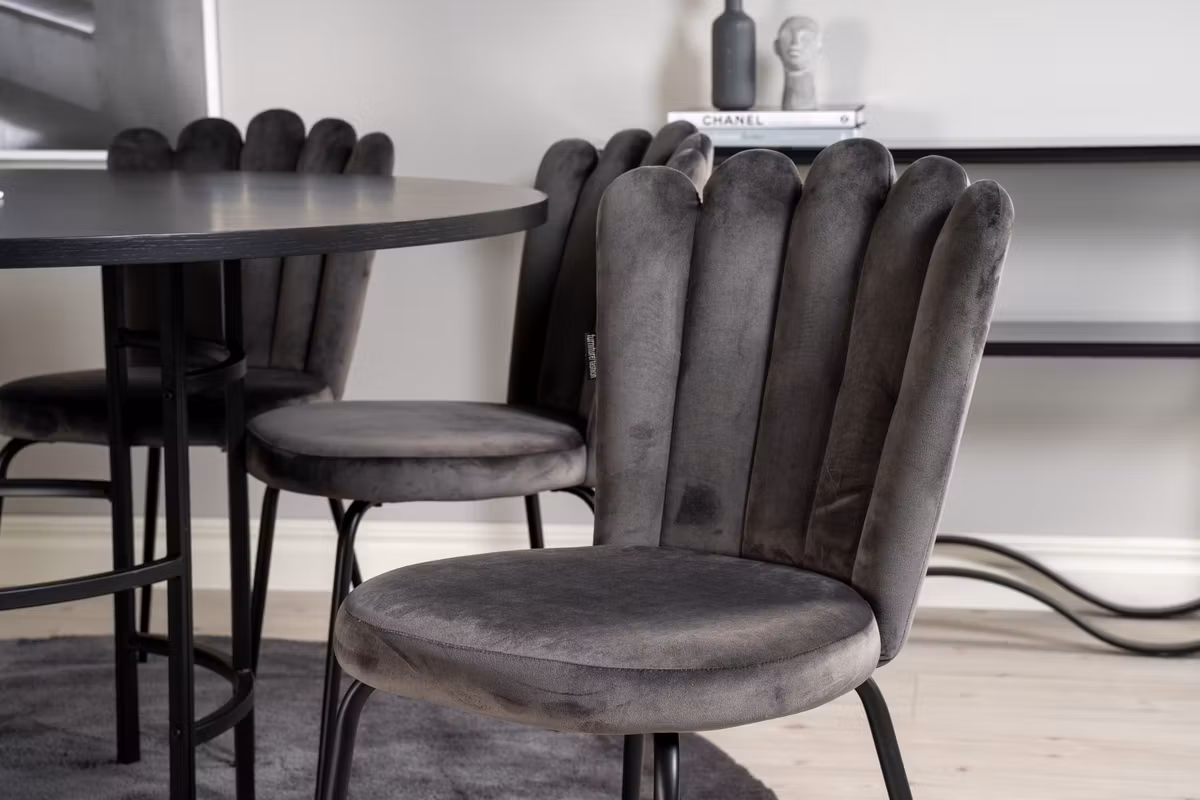 Lika stilren som tidlös – Limhamn matstol är ett säkert val för det moderna hemmet. Den eleganta, snäckformade ryggen med dekorativa sömmar ger stolen ett exklusivt uttryck, medan den runda sitsen i mjukt grått sammetstyg bjuder in till långa, bekväma stunder runt matbordet. De svarta pulverlackerade metallbenen skapar en snygg kontrast och ger en stabil känsla.