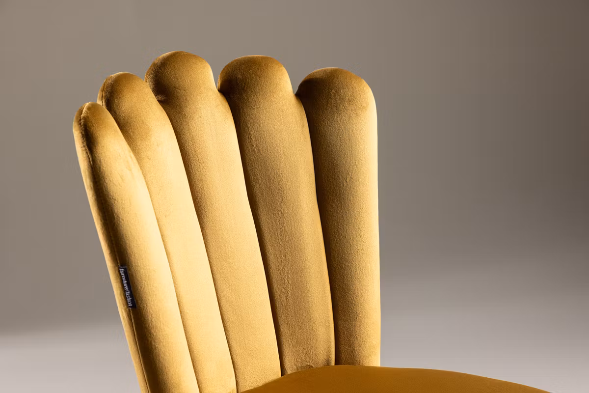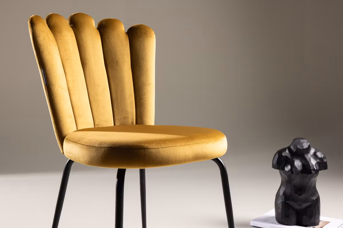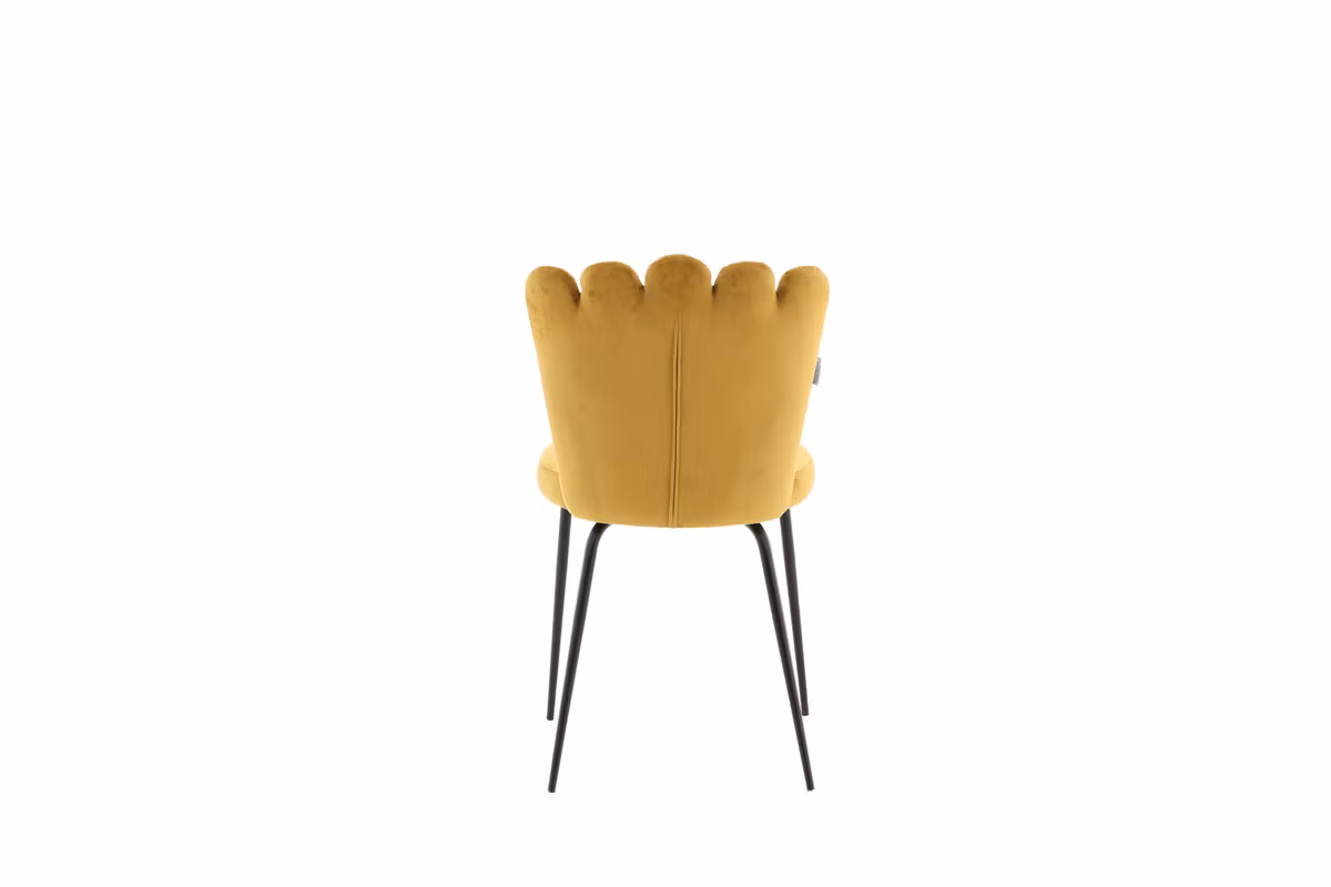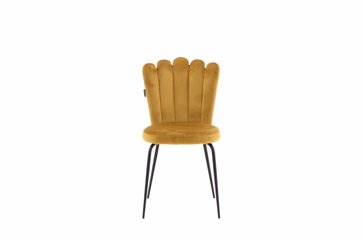 Ge din inredning ett stilfullt lyft med Limhamn matstol – en modern favorit som kombinerar design, komfort och personlighet. Den dekorativa snäckformade ryggen med eleganta dekorsömmar skapar ett exklusivt uttryck, medan den mjuka sitsen i gult sammetstyg tillför en varm och trendig färgklick. De svarta pulverlackerade metallbenen ger en snygg kontrast och en stabil grund.