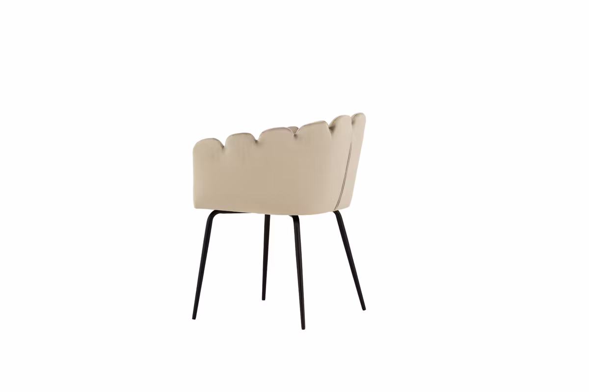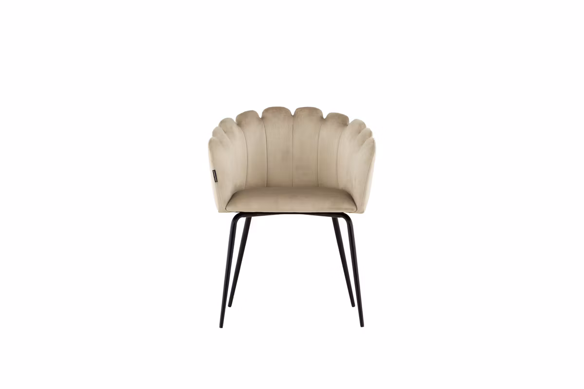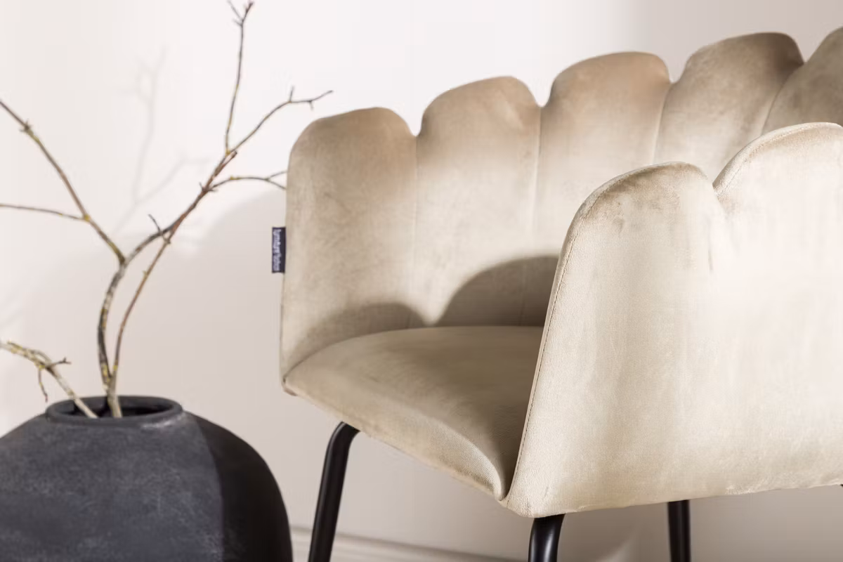 Limhamn matstol är en modern favorit som lyfter matplatsen med både stil och komfort. Den eleganta, snäckformade ryggen med dekorativa sömmar skapar ett mjukt och inbjudande uttryck, medan den rundade sitsen i smakfullt beige sammetstyg erbjuder hög sittkomfort – perfekt för långa middagar och trevliga stunder runt bordet.