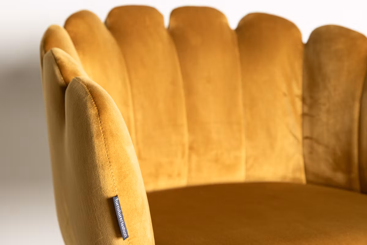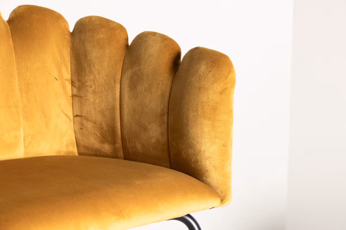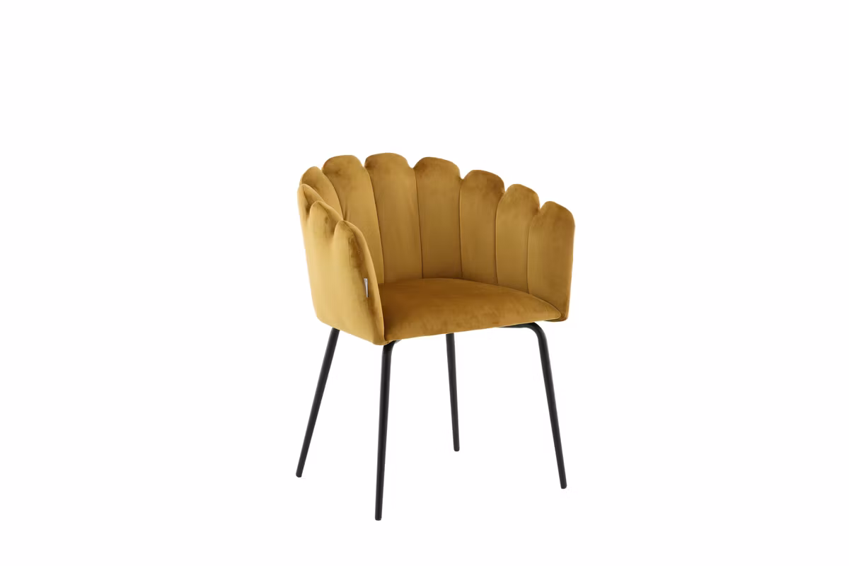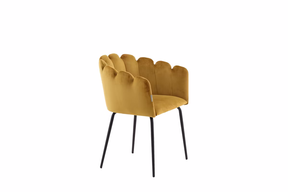 Limhamn matstol är en modern favorit som lyfter matplatsen med både stil och komfort. Den eleganta, snäckformade ryggen med dekorativa sömmar skapar ett mjukt och inbjudande uttryck, medan den rundade sitsen i gult sammetstyg erbjuder hög sittkomfort – perfekt för långa middagar och trevliga stunder runt bordet.