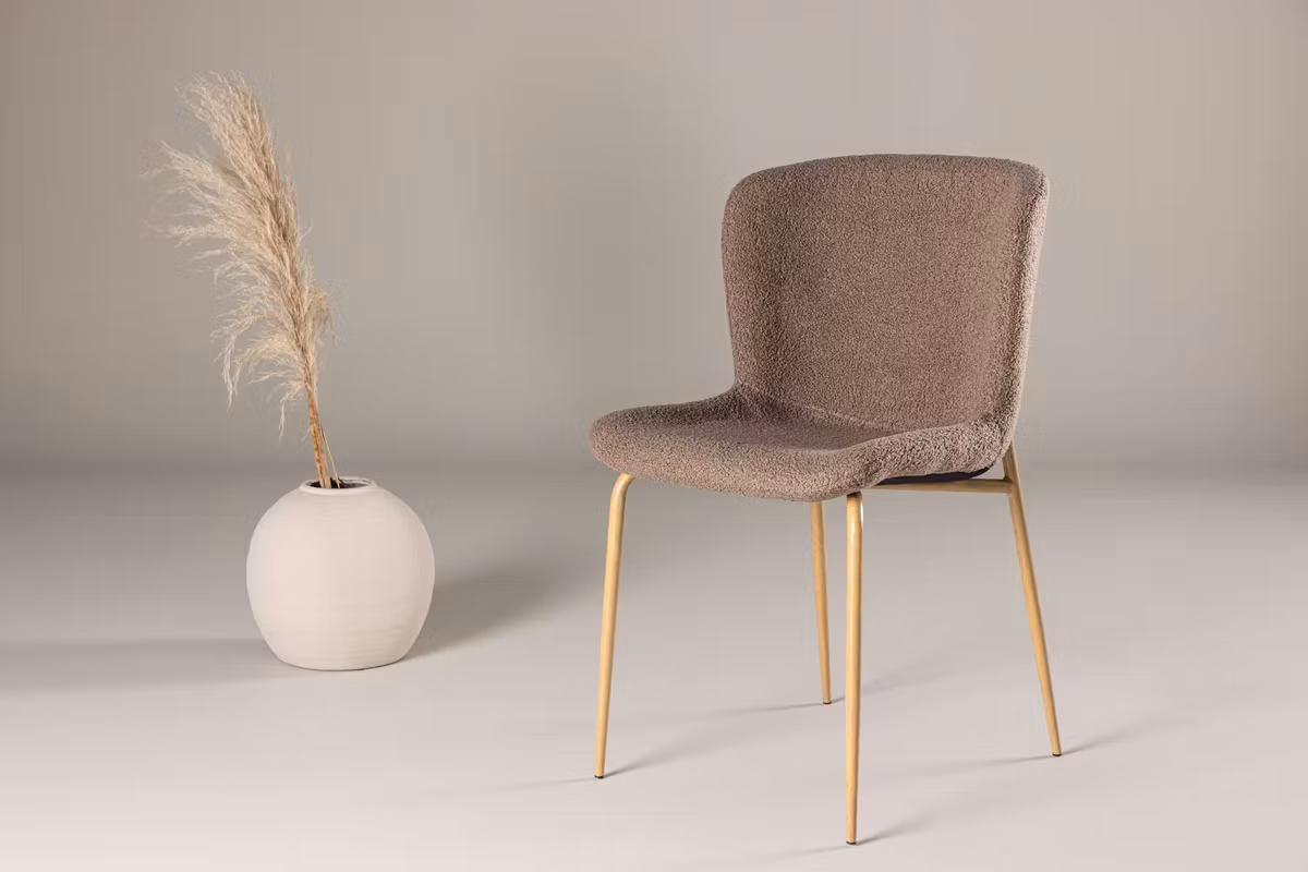 Skapa en inbjudande och stilfull matplats med Modesto, en matstol som kombinerar modern formgivning med en varm och ombonad känsla. Sitsen är klädd i mjukt teddymaterial i en elegant brun nyans, vilket ger både komfort och ett trendigt uttryck. De stabila stålbenen i vacker mocca färg kompletterar designen och förstärker stolens jordnära karaktär.