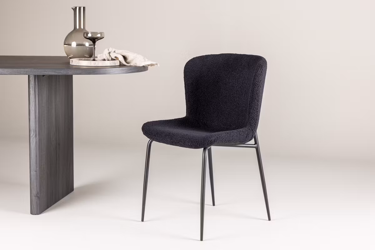 Ge din matplats en stilfull uppgradering med Modesto, en matstol som kombinerar elegans, komfort och modern formgivning. Sitsen är klädd i mjukt, svart teddymaterial som ger en varm och inbjudande känsla, medan de svarta stålbenen skapar en stabil och minimalistisk helhet.