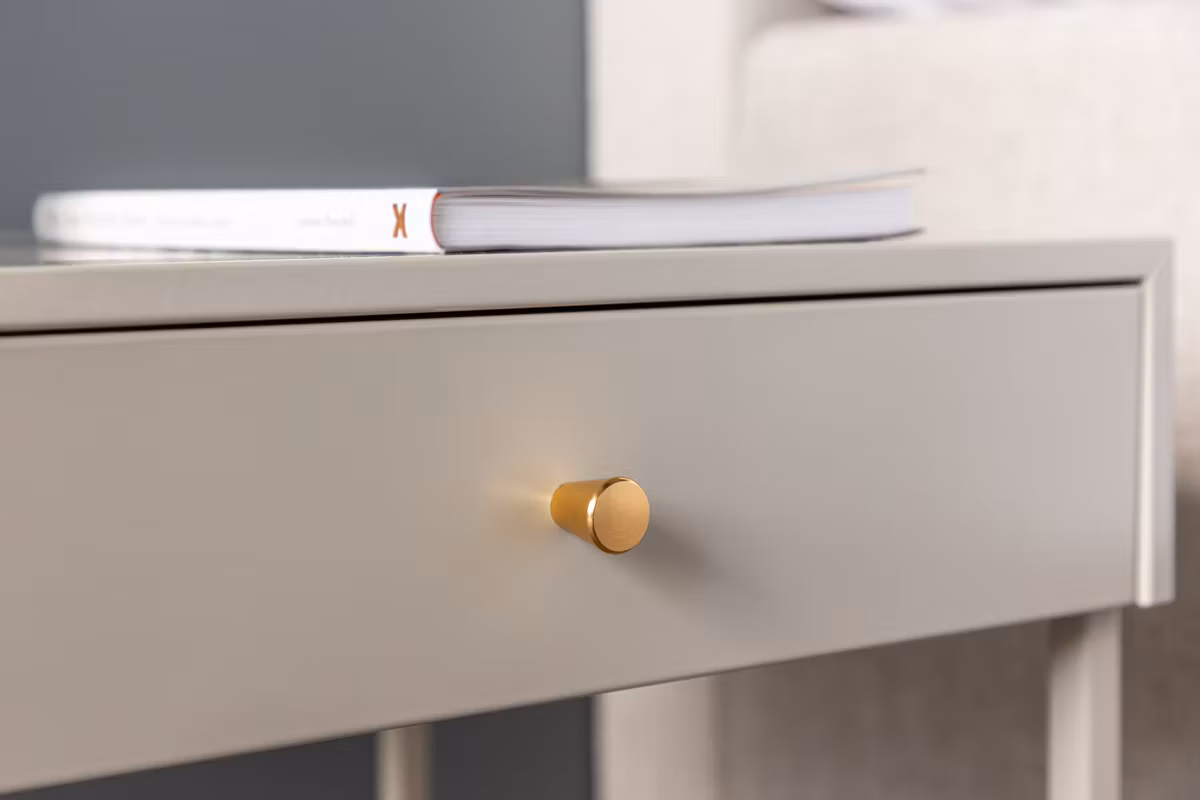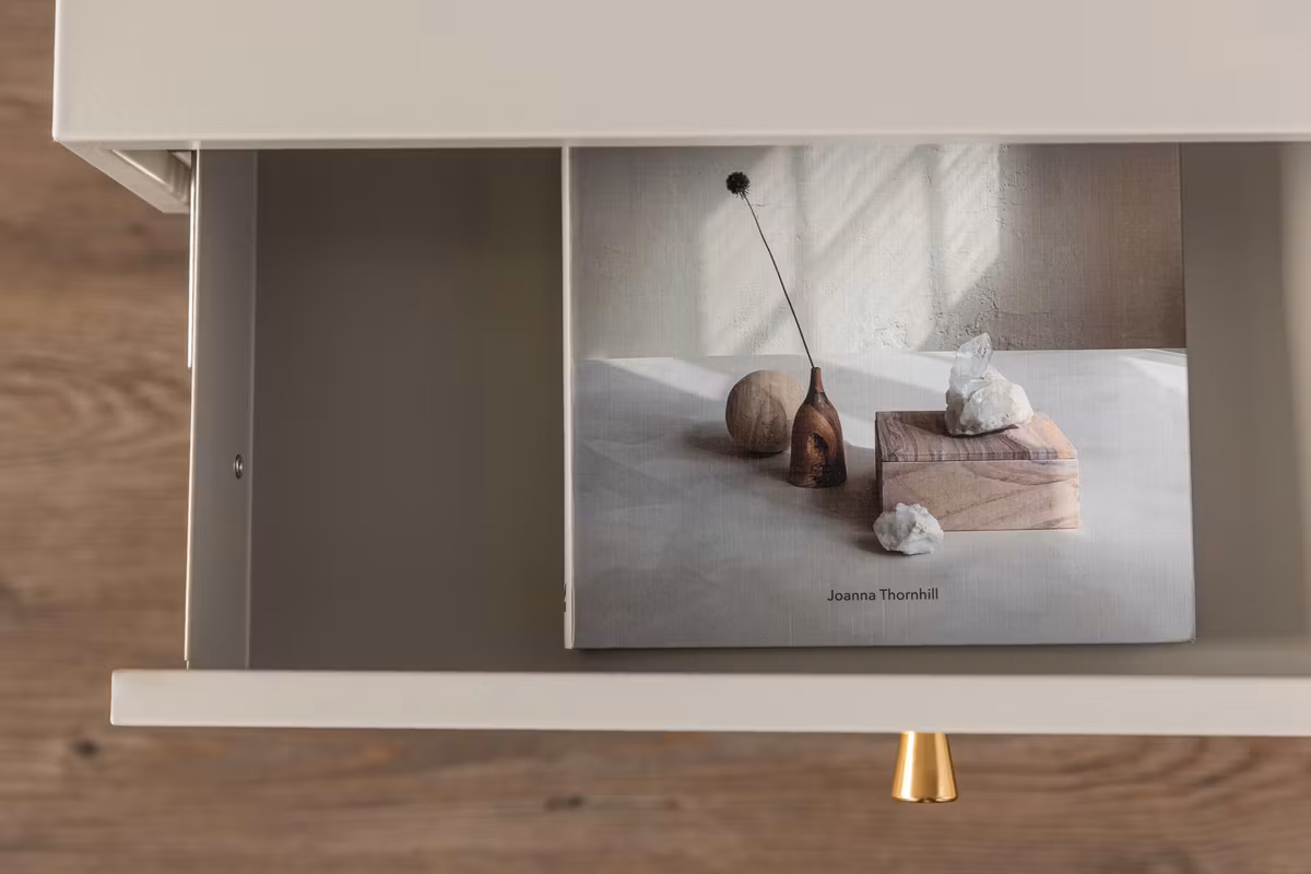 Sängbordet Bakal kombinerar modern nordisk design med smart funktionalitet. Den raka, luftiga formen ger ett stilrent uttryck, medan lådan med mässingsfärgad knopp erbjuder praktisk förvaring för allt du vill ha nära till hands.