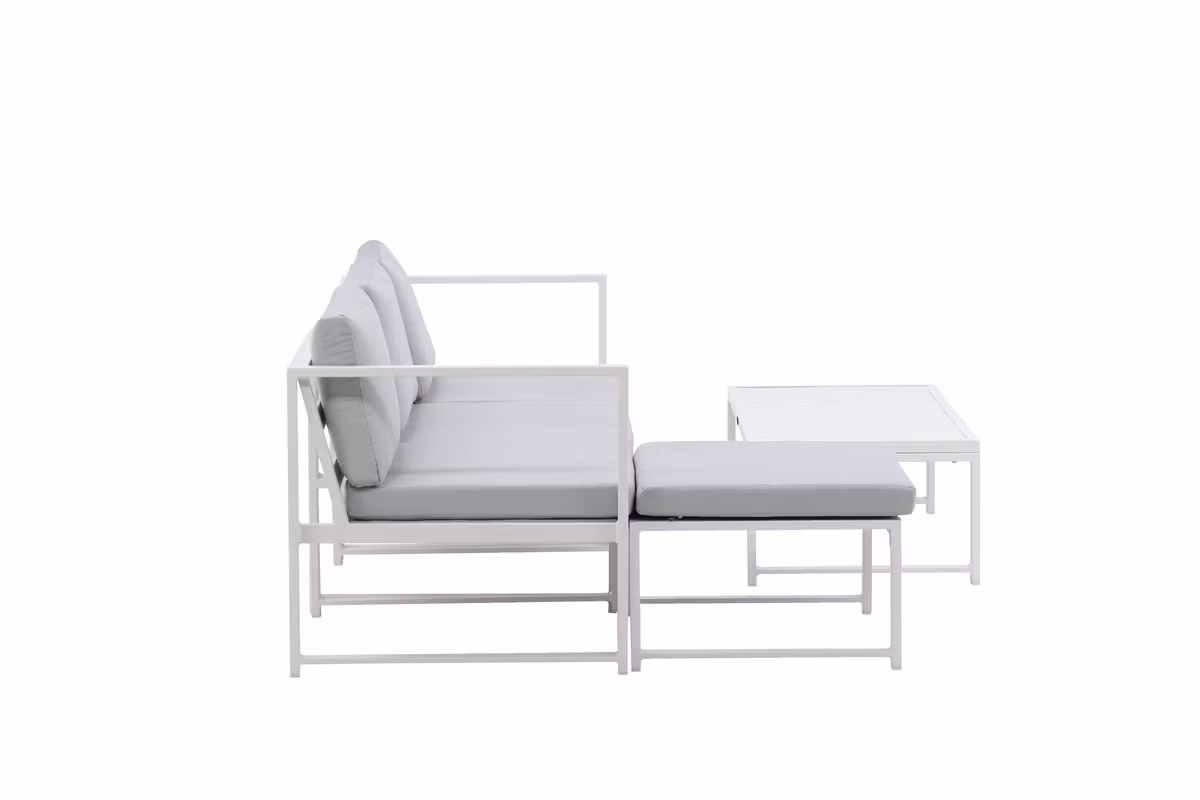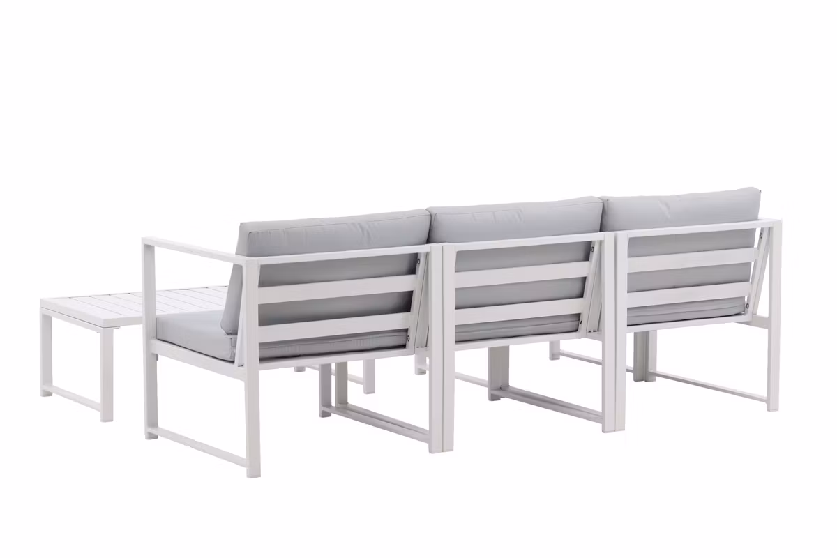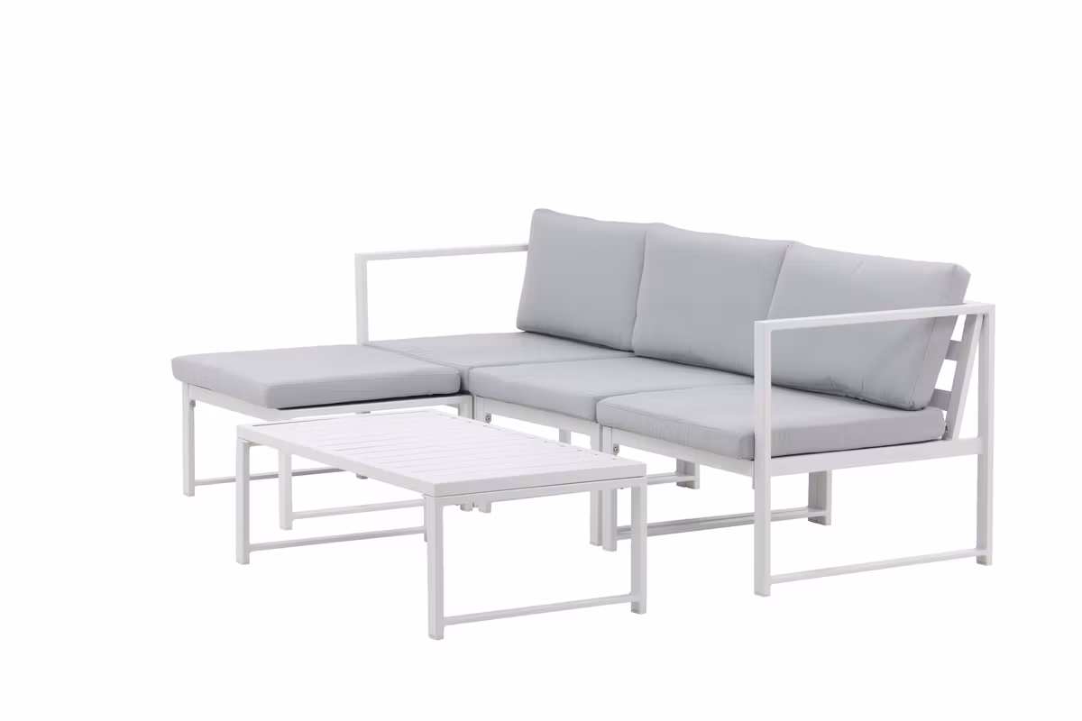 Salvador är en stilren soffgrupp i en behaglig grå kulör som imponerar med sin genomtänkta helhetsdesign. Gruppen består av en rymlig tresitssoffa med divandel samt ett matchande soffbord – perfekt för både avkoppling och sociala stunder. Den vita pulverlackerade stommen i metall och aluminium gör möbeln både lättskött och tålig för utomhusbruk, medan de mjuka ljusgrå dynorna ger hög komfort.