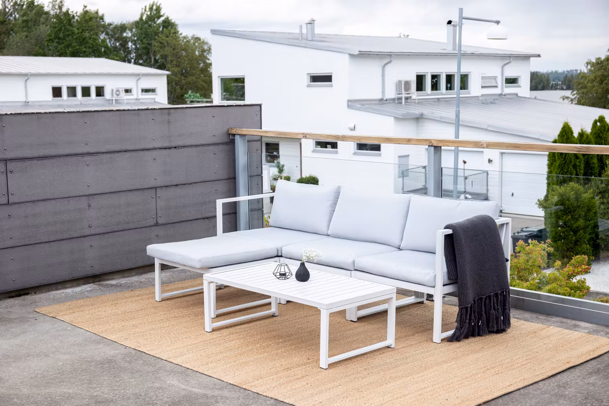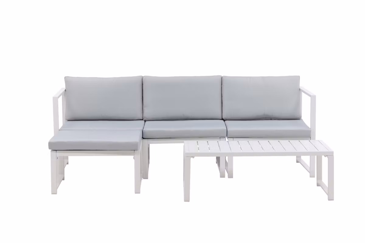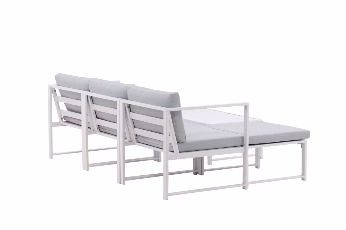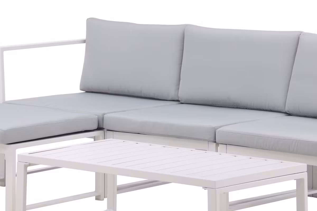 Salvador är en stilren soffgrupp i en behaglig grå kulör som imponerar med sin genomtänkta helhetsdesign. Gruppen består av en rymlig tresitssoffa med divandel samt ett matchande soffbord – perfekt för både avkoppling och sociala stunder. Den vita pulverlackerade stommen i metall och aluminium gör möbeln både lättskött och tålig för utomhusbruk, medan de mjuka ljusgrå dynorna ger hög komfort.