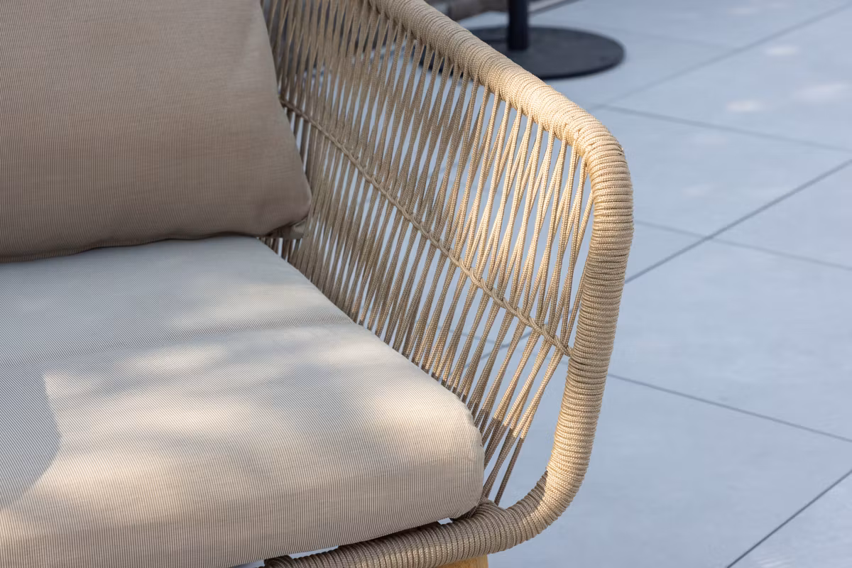 Stommen i aluminium gör möblerna både stabila och lättskötta, medan ben och detaljer i acacia tillför en exklusiv touch. Rygg och sidor är smakfullt flätade i beigefärgat rep, vilket skapar ett modernt och luftigt uttryck. Kombinationen av naturliga material och stilren design gör Chania till ett självklart val för en elegant uteplats.