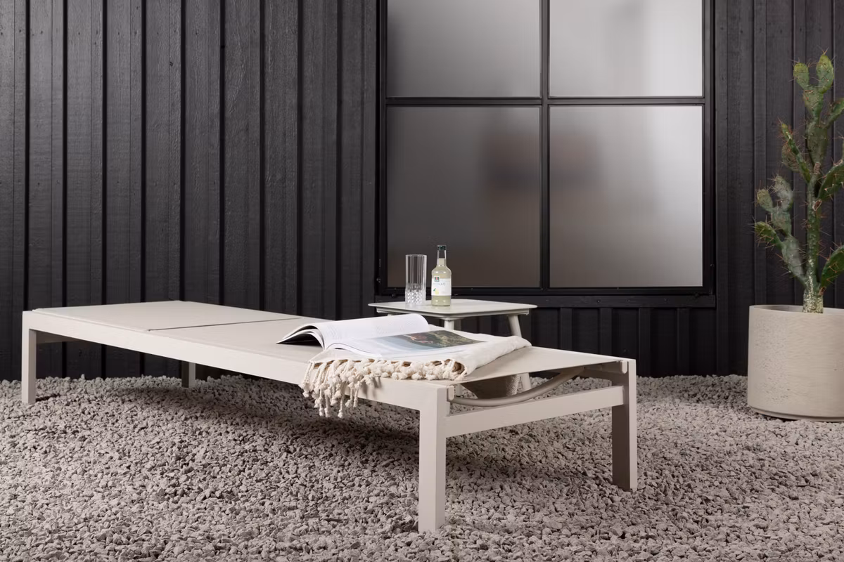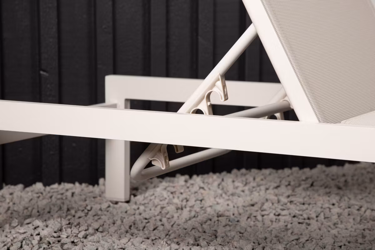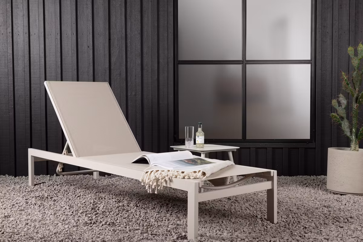 Den justerbara ryggdelen gör det enkelt att hitta din perfekta position, oavsett om du vill luta dig tillbaka och koppla av eller sitta upp och njuta av en bok eller något svalkande att dricka. Den stilrena, minimalistiska designen gör att solsängen passar lika fint vid poolen som på altanen eller i trädgården.