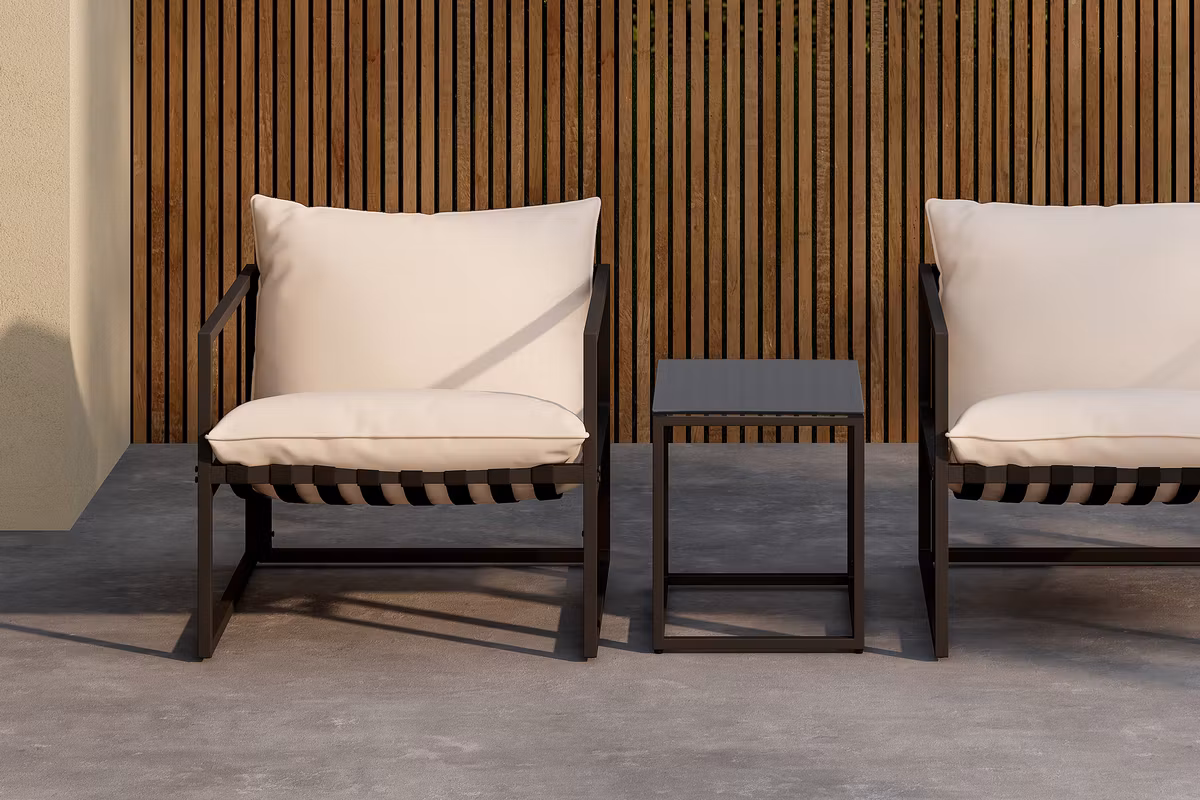 Messina består av två bekväma fåtöljer och ett stilrent glasbord – den perfekta kombinationen för avkopplande stunder i solen. Fåtöljerna är tillverkade i robust stål och levereras med mjuka dynor i slitstark polyester, vilket ger en härlig sittkomfort. Bordet har en elegant glasskiva på stålram, som både är snygg och hållbar.
