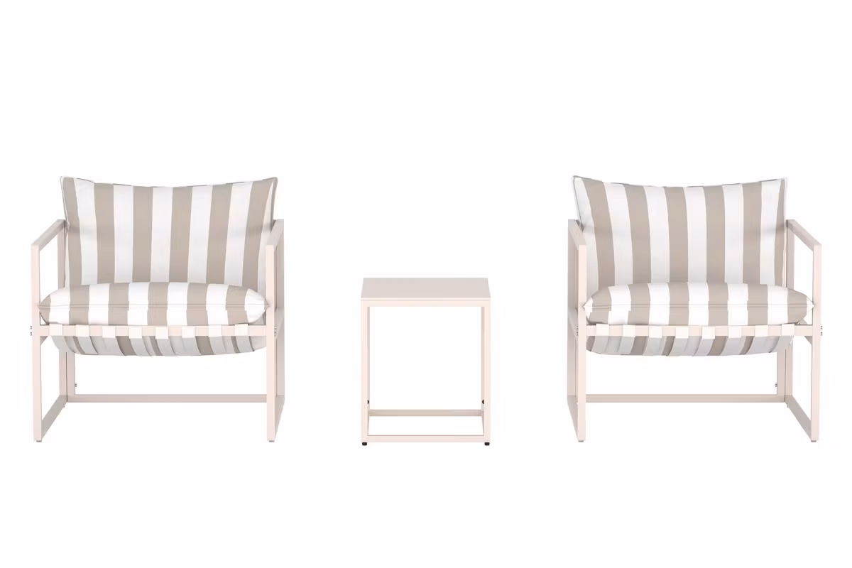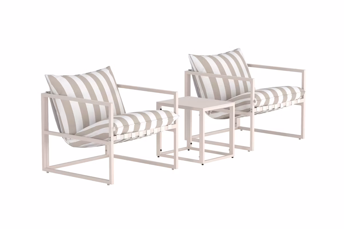 Messina loungegrupp kombinerar modern design med inbjudande komfort. Den beiga stommen tillsammans med härligt randiga dynor i vitt och beige skapar en fräsch och harmonisk känsla som passar perfekt på uteplatsen, balkongen eller vid poolen.