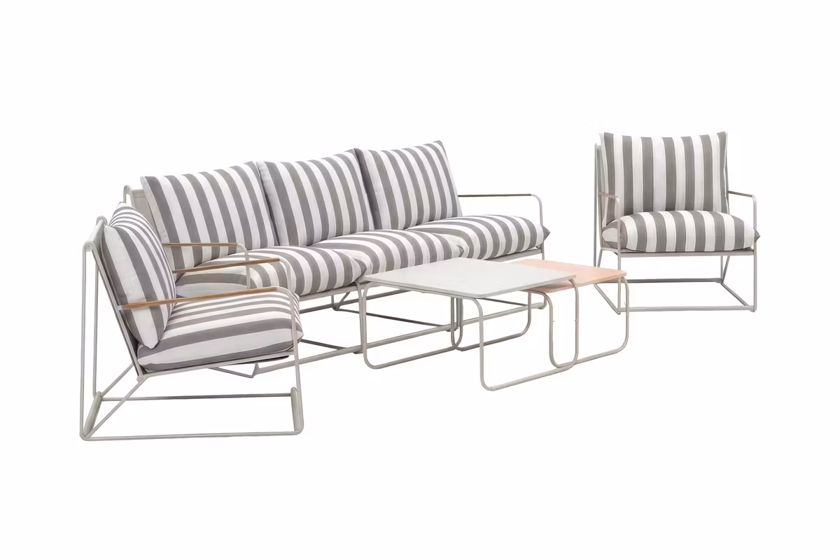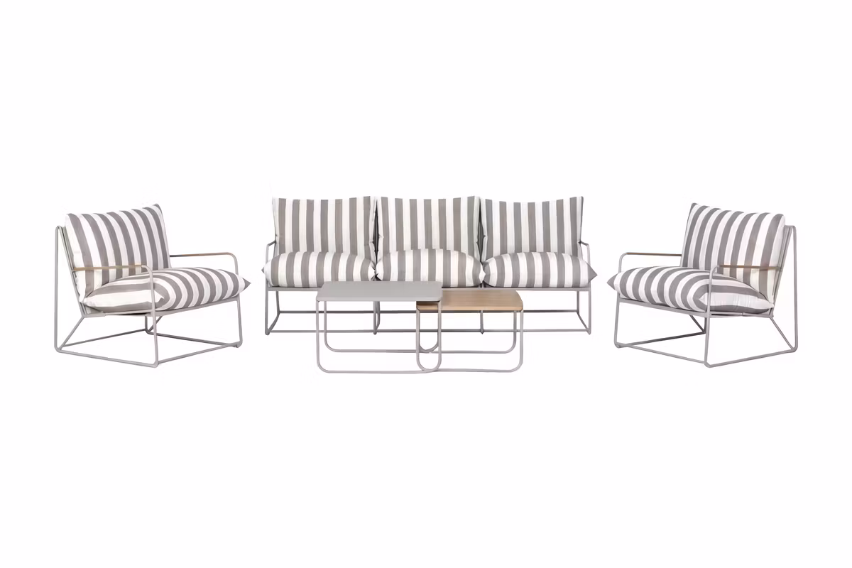 Setet består av en rymlig soffa, två bekväma fåtöljer och ett matchande bord – en perfekt helhet för både avkopplande stunder och trevliga sammankomster med familj och vänner. De mjuka dynorna ger hög komfort samtidigt som designen lyfter helhetskänslan på din uteplats.