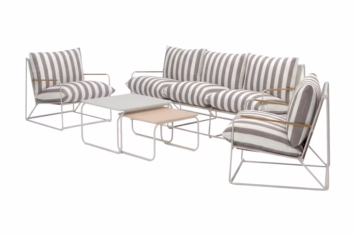 Förvandla din uteplats till en inbjudande oas med Palazzo – en soffgrupp som kombinerar komfort med tidlös design. Den vita stommen tillsammans med dynor i klassiska beige- och vitränder skapar ett ljust och elegant uttryck som passar perfekt i alla utomhusmiljöer.