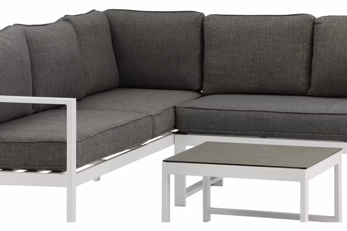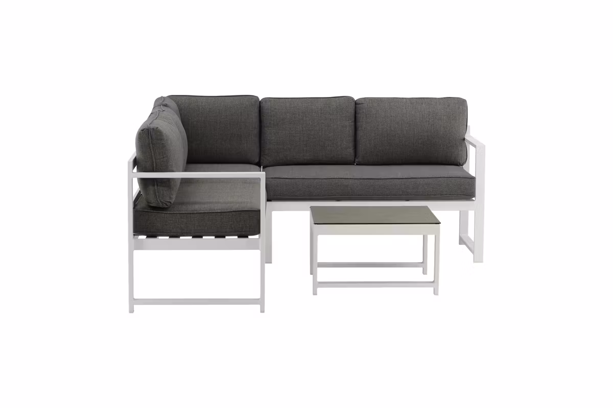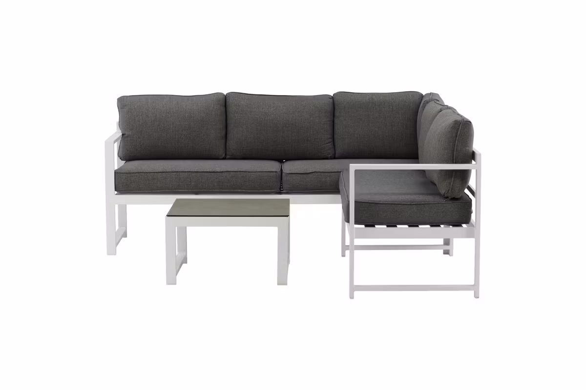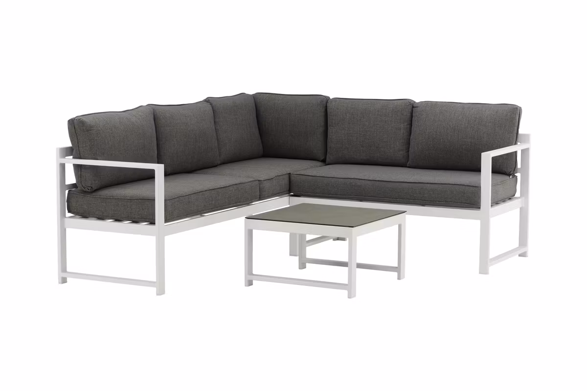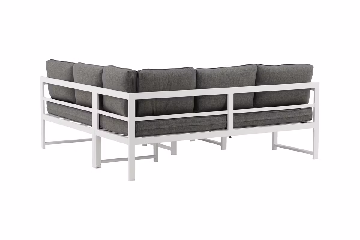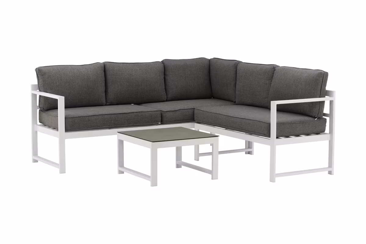 Förvandla din uteplats eller altan till en elegant och inbjudande loungemiljö med denna moderna soffgrupp i tidlös design. Den vita pulverlackerade metallstommen med integrerade armstöd ger ett luftigt och stilrent uttryck, medan de mjuka grå dynorna bjuder in till långa, bekväma stunder. Det låga soffbordet med glasyta och exklusiv granitfinish sätter pricken över i:et och skapar en sofistikerad helhet.