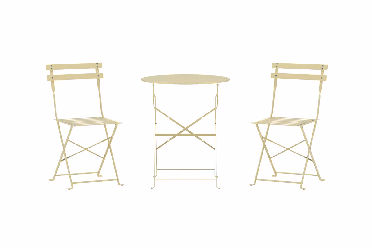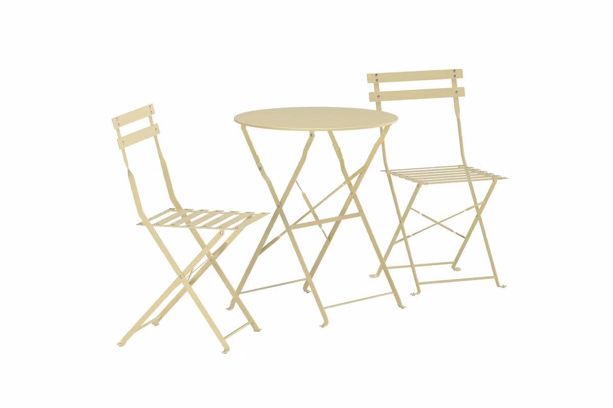 Både bordet och stolarna är praktiskt hopfällbara, vilket gör dem enkla att flytta och smidiga att förvara när de inte används. Perfekt för dig som vill kombinera funktion med stil – oavsett om det är för morgonkaffet, en avslappnad frukost eller en lugn stund i solen.