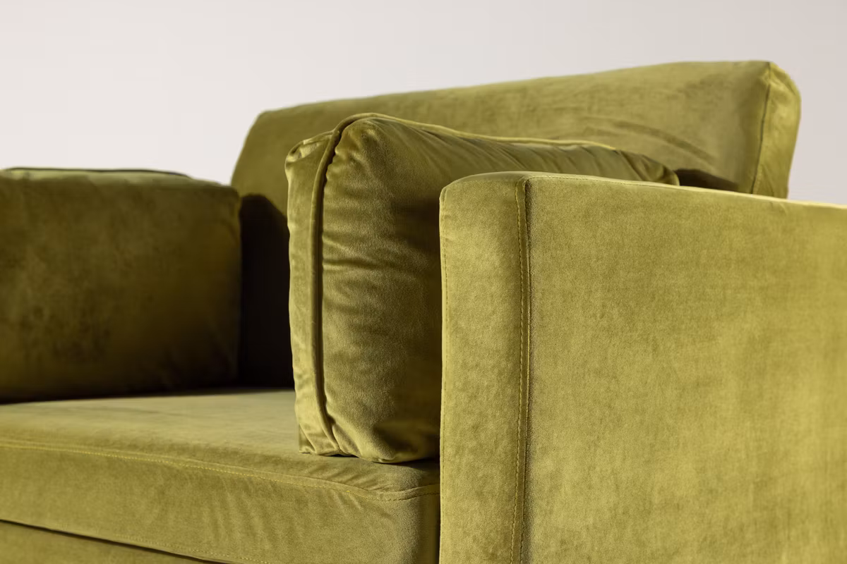 Serien Boom kombinerar en genomtänkt helhetsdesign med raka, stilrena linjer och mjukt rundade former. De smala, höga benen ger ett elegant och luftigt intryck, medan det generösa sittdjupet bjuder in till långa, bekväma stunder av avkoppling. Det lena sammetstyget fångar ljuset på ett exklusivt sätt och skapar ett vackert lyster som lyfter hela inredningen.