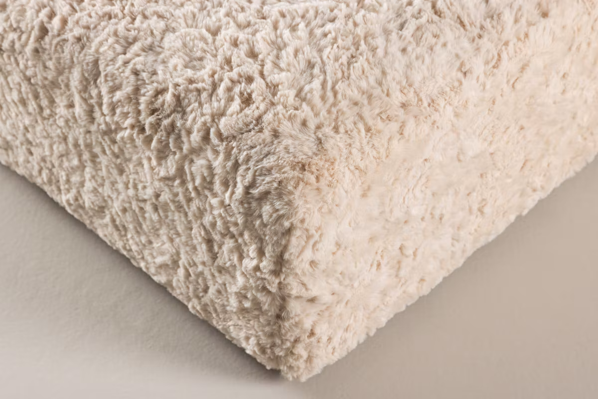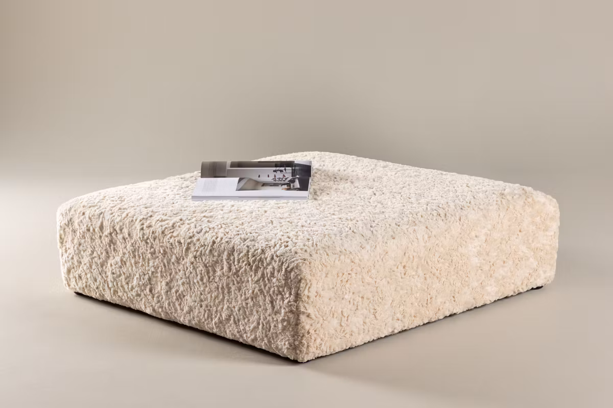 Frankie är klädd i beige fejkpäls av 100% teddy-polyester, vilket ger en otroligt mjuk och inbjudande textur. Den generösa, kvadratiska formen gör sittpuffen till en mångsidig möbel som fungerar lika bra som extra sittplats, fotpall eller dekorativ detalj i rummet.