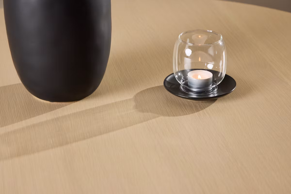 Den rundade formen och den vittvättade finishen framhäver träets naturliga skönhet och ger bordet ett luftigt, sofistikerat uttryck. Den mjuka, neutrala färgtonen gör det enkelt att matcha med andra möbler och inredningsdetaljer – perfekt för både moderna och klassiska hem.